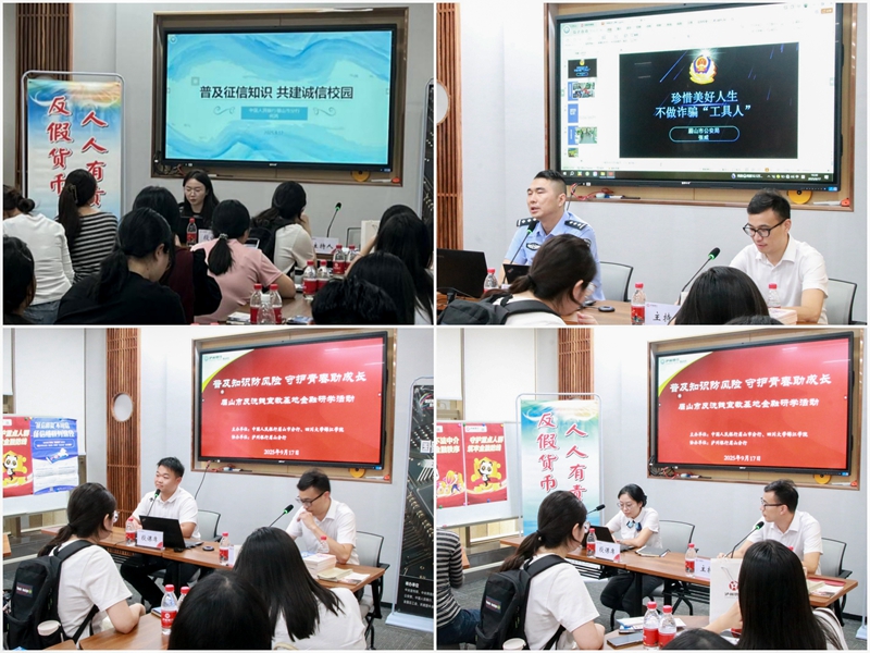 在泸州银行眉山分行,师生首先参观了银行各功能区域,了解银行日常运营流程及各职能部门职责分工,直观感受金融机构的实际运行场景。泸州银行眉山分行营业部李晓旭以存取款、转账、开户等常见业务为例,详细讲解柜面业务操作流程;中国人民银行眉山市分行支付结算科副科长雷宏围绕第二代支付系统的核心功能、运行机制及其对社会经济的影响展开讲解;在金融知识专题讲座中,李晓旭以“反洗钱”为主题,通过剖析兼职陷阱、账户出借等典型风险场景,揭示洗钱犯罪的常见手法,强调“不出借银行卡、不代他人转账”的意识;中国人民银行眉山市分行征信管理科何芮则围绕征信报告内容、信用记录对升学就业的影响以及良好信用的维护方法,深入浅出地解读征信政策。