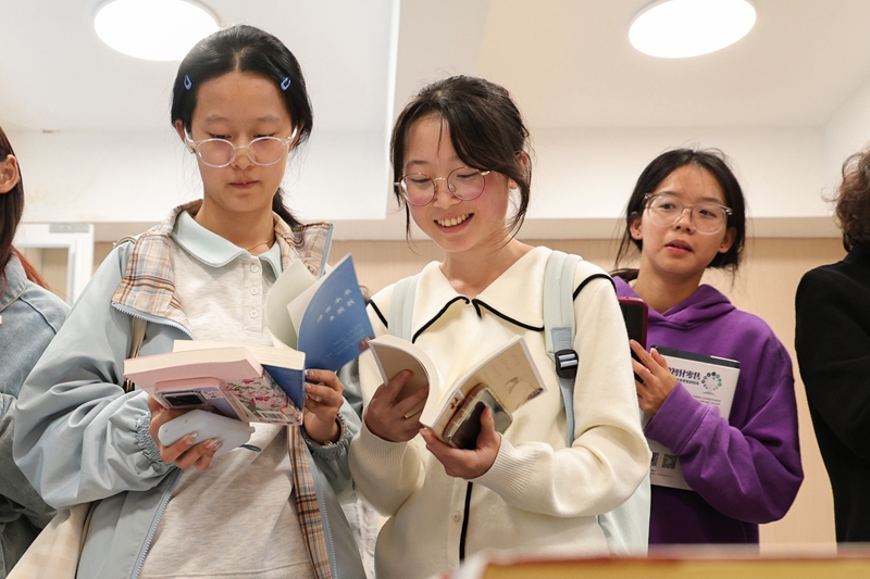 本次书展涵盖人工智能、文学、历史等专业前沿优质新书,门类丰富、内容多元,切实满足了同学们的多样化阅读需求。书展现场俨然一个“社区微型读书沙龙”,吸引了众多同学参与。大家三两成群,或静静品读,或低声交流,或扫码借书,在傍晚的闲暇时光里共享安心自在。