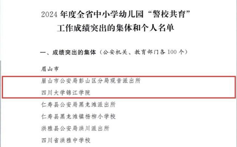 近日,四川省公安厅、教育厅联合下发《关于对 2024 年度全省“警校共育”工作成绩突出的集体和个人予以表扬的通报》,对在2024年“警校共育”中结成“对子”共同帮扶、密切协作,并取得突出成绩的200个集体和200名个人予以通报表扬。我校与眉山市公安局彭山区分局观音派出所结对上榜,获评“2024年度全省‘警校共育’工作成绩突出集体”。