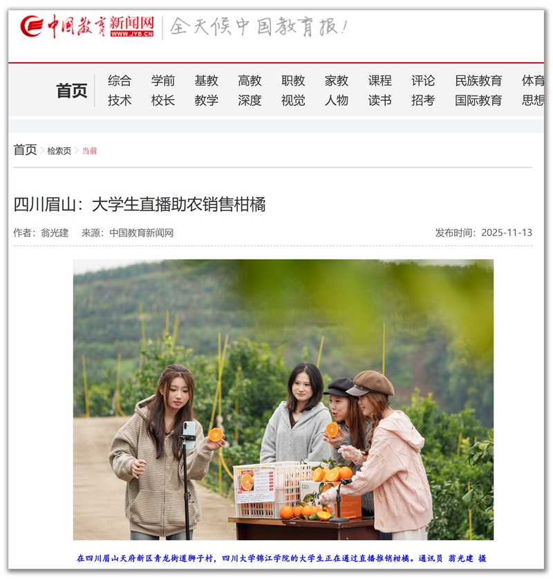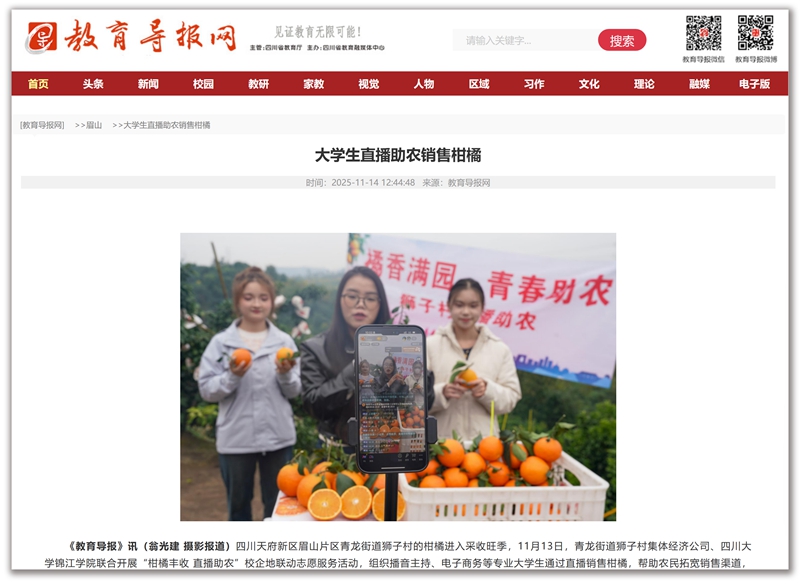 锦江学子直播助农的行动,获得多家主流媒体的广泛关注。《四川日报》4版要闻以图片新闻的形式记录了大学生直播助农的场景,生动展现了学生主播在柑橘园里边采摘边讲解的现场实况;中国教育新闻网对活动进行了报道,突出了校企地联动志愿服务的特点,强调了活动对帮助农民拓宽销售渠道,带动增收的实际成效。