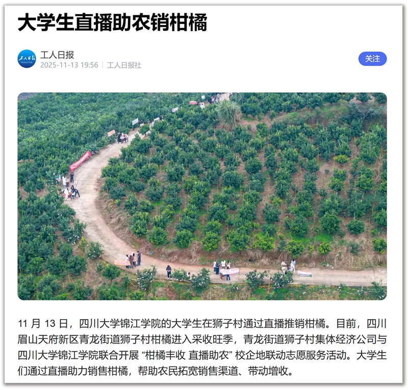 眉山天府新区青龙街道狮子村的柑橘园里,大学生主播们的声音随着网络信号传向四方。这场直播助农,不仅为当地柑橘打开了新的销路,更在年轻学子的心中,埋下了一颗服务乡村、振兴乡村的理想种子。