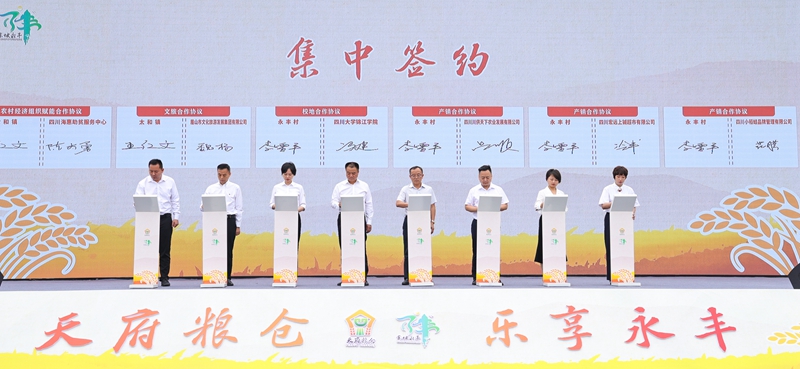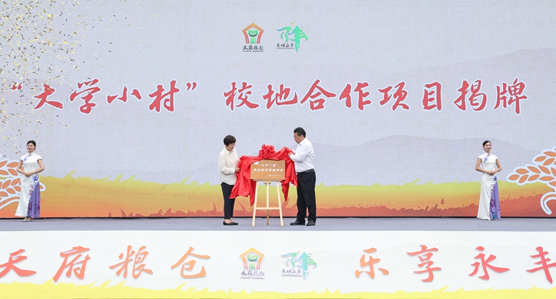 2024年盛夏,眉山市东坡区永丰村成功举办“永远丰收”系列产品发布暨产销合作签约仪式。川大锦江学院校友、永丰村集体公司CEO邓凯代表永丰村现场推介了“永丰五宝”特色农产品。同期,学校与永丰村签署“大学小村”校地合作框架协议,确立为期五年的深度合作计划,旨在将乡村发展的实际需求转化为学校的研究课题,共同推动永丰村建设成为宜居宜业、和美乡村的示范典型。