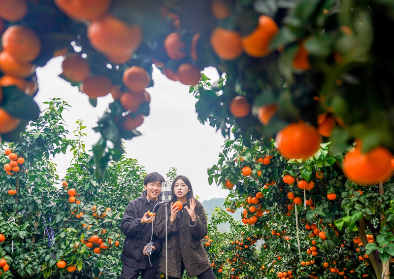 果园中迎来了一群特别的“新农人”——来自万象城平台的大学生主播。他们架起手机、打开补光灯,在累累硕果间现场讲解、试吃展示,通过电商平台,热情地将狮子村的柑橘推介给全国各地的消费者。