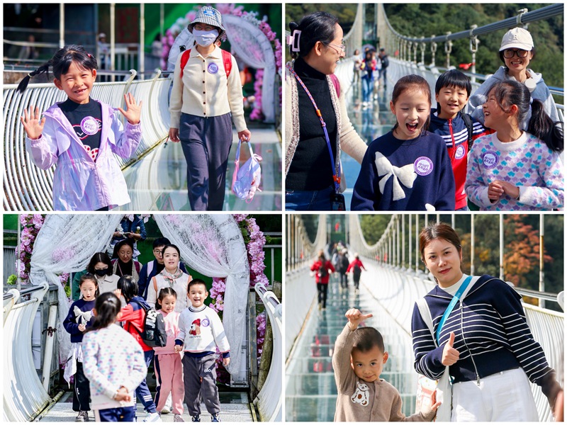 玻璃吊桥在阳光下熠熠生辉,与山下湖面粼粼波光交织成一幅“浮光跃金”的流动画卷。大家纷纷踏上透明步道,俯瞰脚下碧波轻漾,远望茶山层叠如浪,恍如开启了一段美妙的“云端漫步”。山风温柔,松涛在耳畔低语,大家顺着蜿蜒山径徐徐而上,畅快呼吸负氧离子,全身心沉浸于自然的馈赠,疲惫尽释,步履生轻。