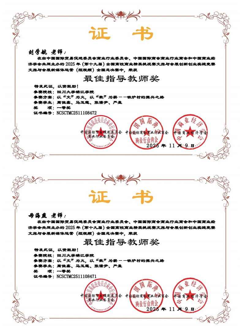 11月9日,在第十九届全国高校商业精英挑战赛文旅与会展创新创业实践竞赛中,我校选送的短视频作品《以“文”为火,以“数”为薪——铁炉村的振兴之路》荣获文旅与会展新媒体运营赛道全国总决赛一等奖,实现了学校在该项赛事中的新突破。