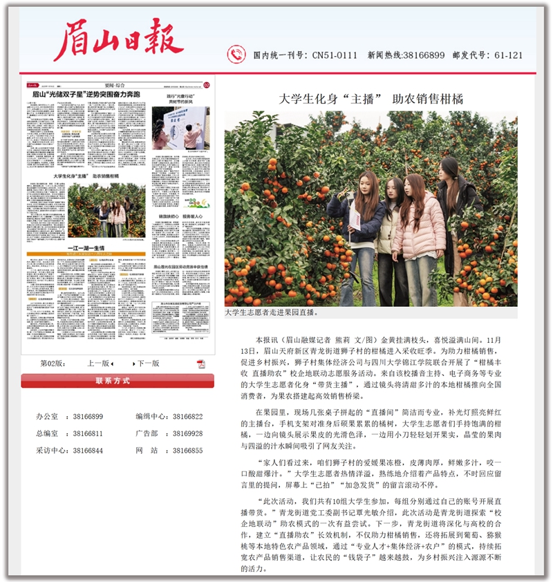 报道以版面大图形式,生动呈现锦江学子如何将课堂所学运用于现实场景,通过电商直播有效帮助农户拓宽柑橘销售渠道、带动增收,充分展现了万象城平台在搭建理论与实践桥梁、推动“学以致用、助农兴农”方面的扎实成效。