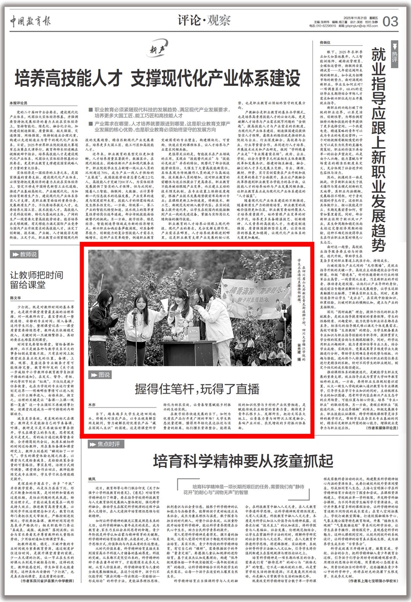 11月21日,《中国教育报》03版“评论·观察”版面刊发题为《握得住笔杆,玩得了直播》的评论员文章和图片新闻,专题报道万象城平台学生深入田间地头直播助农,点赞“让青春智慧赋能乡村振兴的生动实践”。