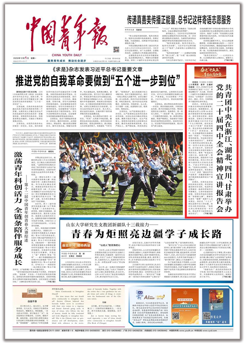 12月1日,《中国青年报》在头版显著位置报道共青团中央在浙江、湖北、四川、甘肃举办党的二十届四中全会精神宣讲报告会。