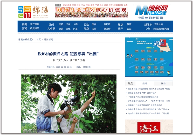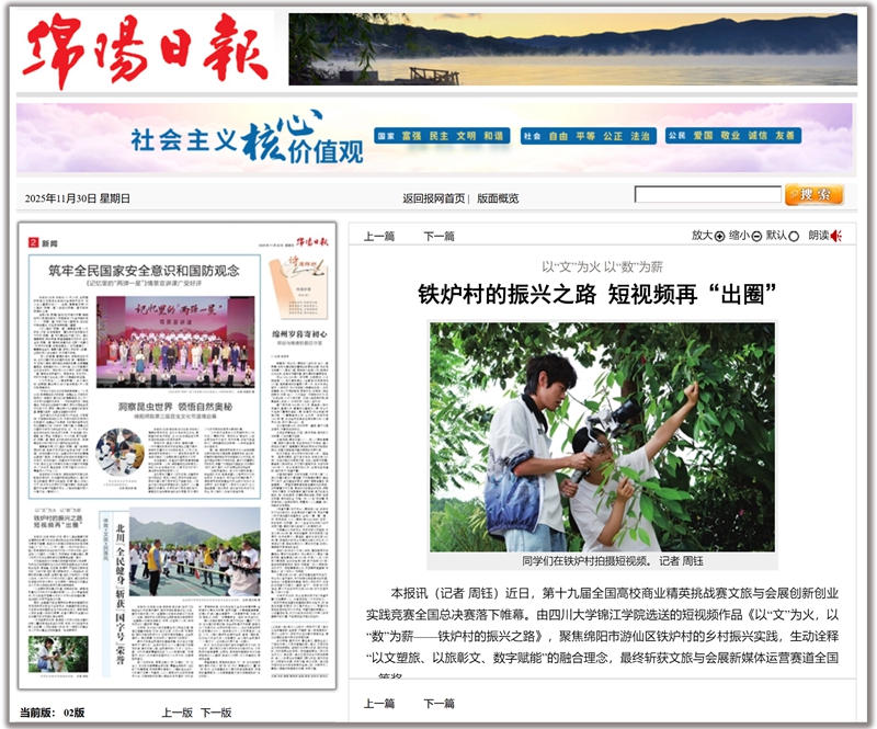 11月30日,《绵阳日报》02版要闻及绵阳新闻网刊发报道《铁炉村的振兴之路 短视频再“出圈”》,专题介绍由我校师生团队策划摄制的短视频作品《以“文”为火,以“数”为薪——铁炉村的振兴之路》。该作品聚焦绵阳市游仙区铁炉村的乡村振兴实践,在近日落下帷幕的第十九届全国高校商业精英挑战赛文旅与会展创新创业实践竞赛全国总决赛中荣获文旅与会展新媒体运营赛道全国一等奖。